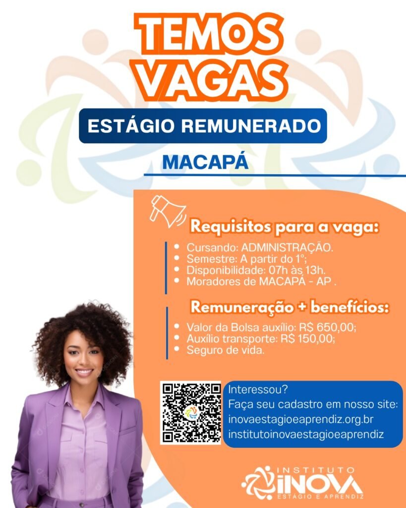 Horário de estágio: 07h às 13h;Valor da Bolsa auxílio: R$ 650,00;Auxílio transporte: R$ 150,00Seguro de vida.